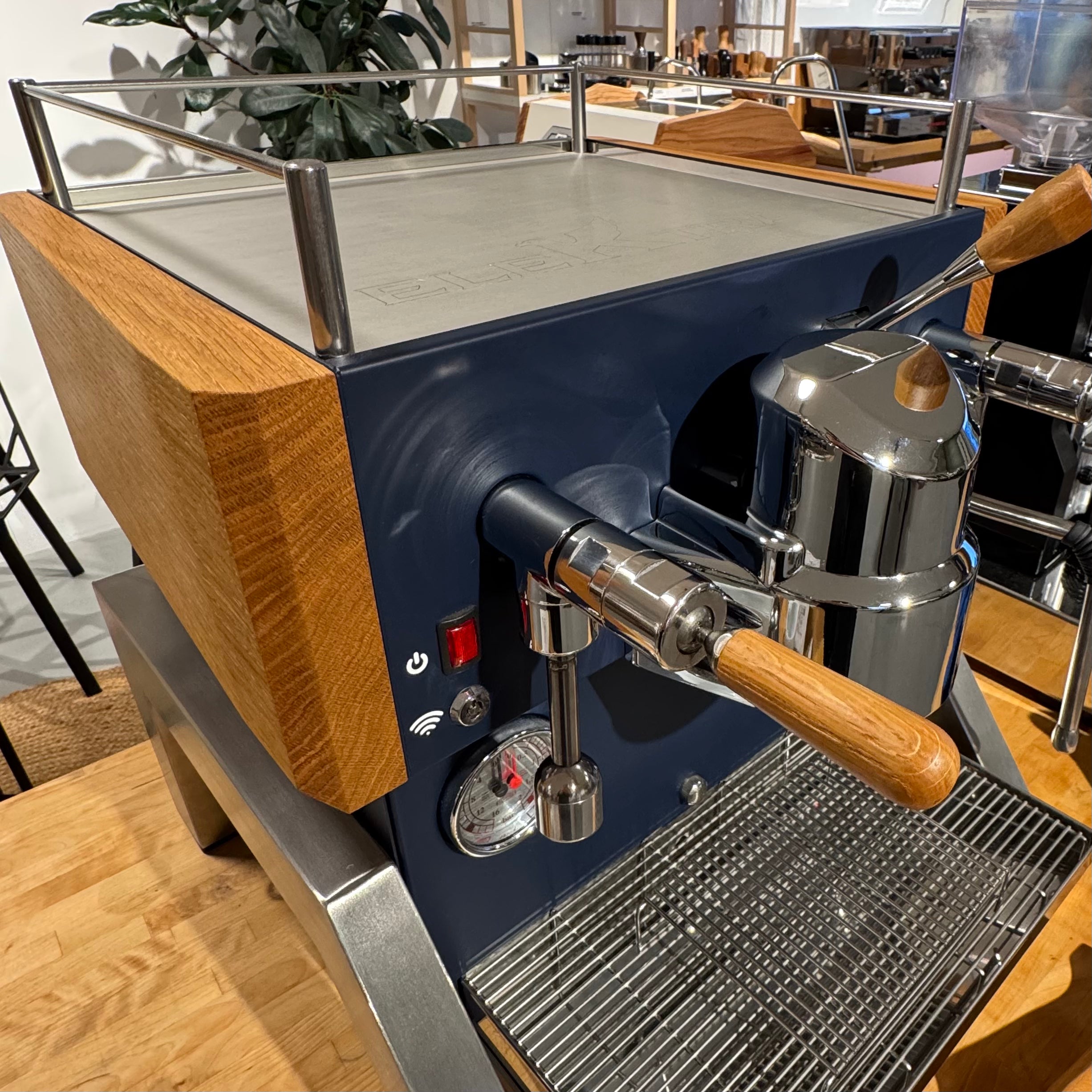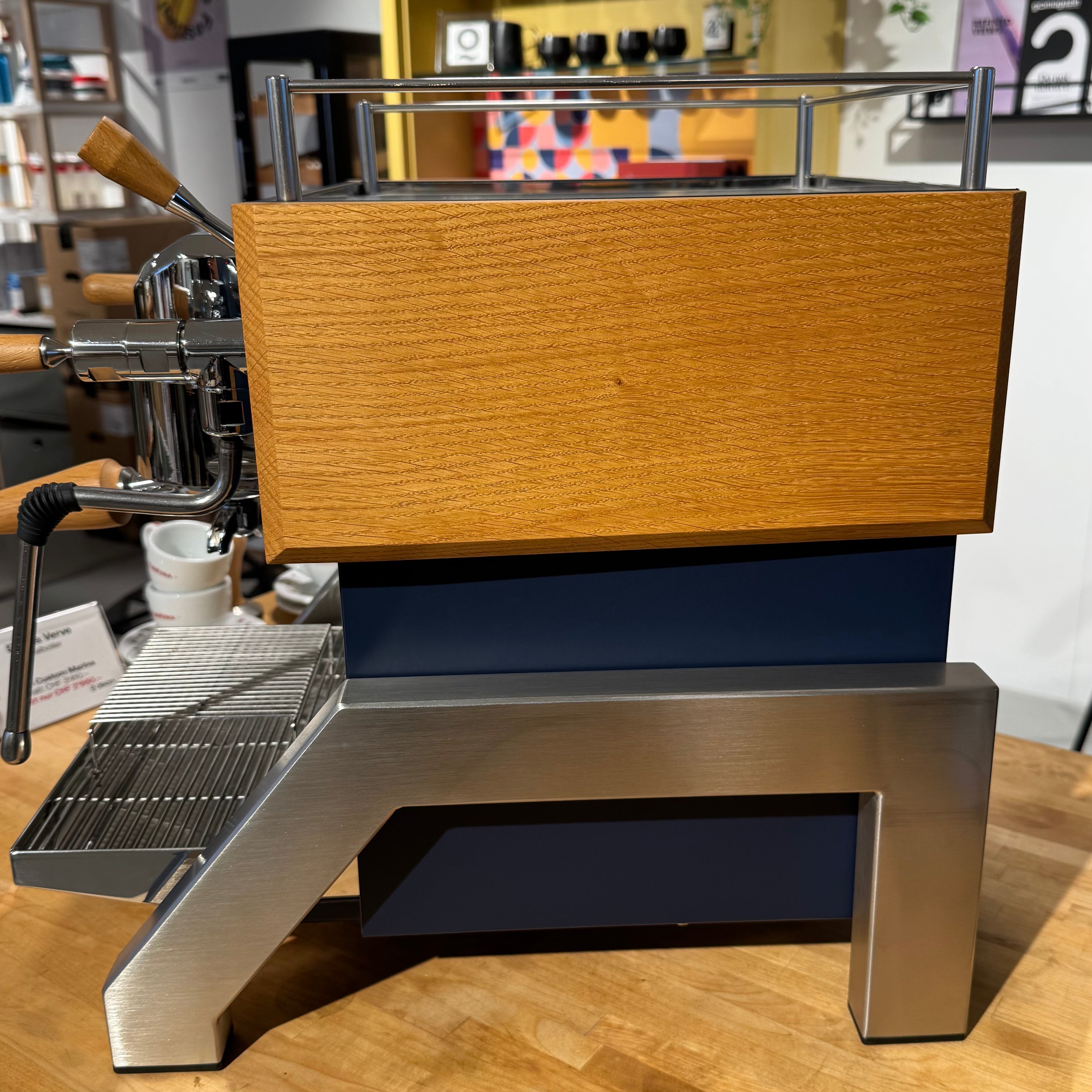 Dieses Gerät ist eine individualisierte "made by deon" Maschine. Das gehäuse wurde in einem Marineblau foliert und mit "Marina Bay" Grafiken ergänzt. Zur weiteren Veredelung wurden Eichenarmaturen verbaut und speziell für dieses Modell eine Tassenablage aus gefrästem Aluminium angefertigt.